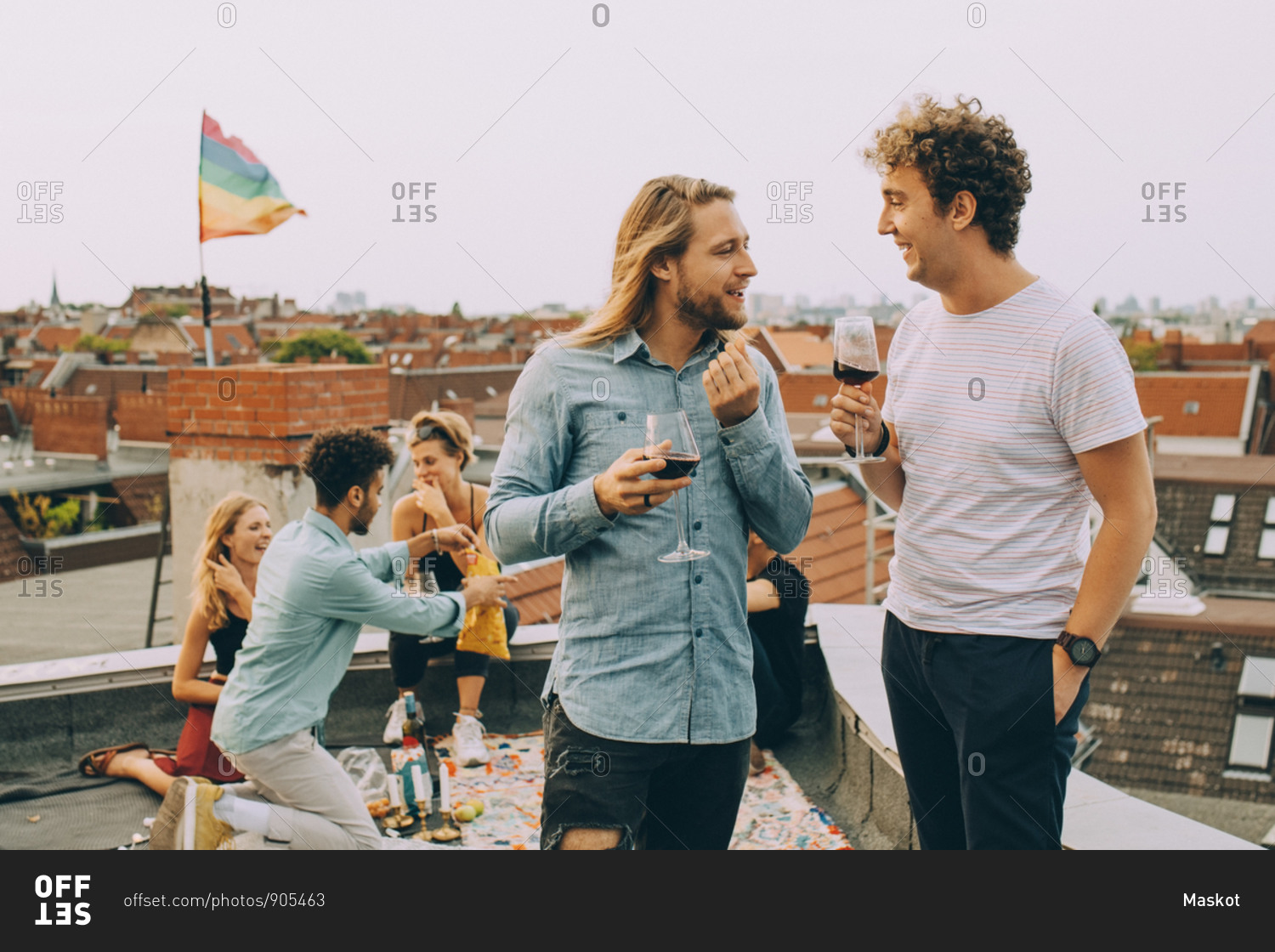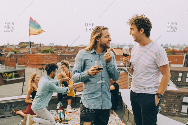 Friends having wine and talking while friends enjoying on terrace at rooftop party