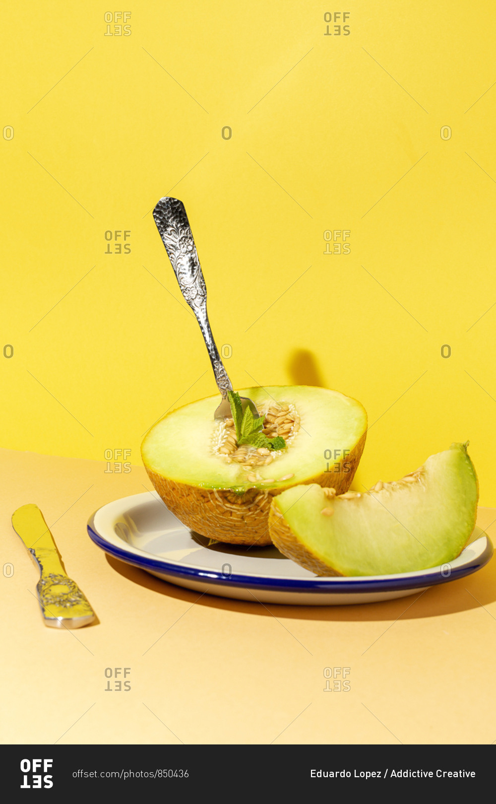 From above cut ripe appetizing sweet pitted melon on plate with spoon and fork in yellow table