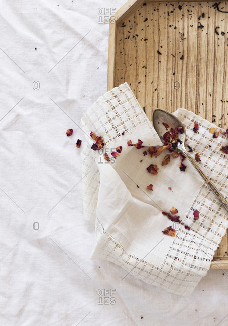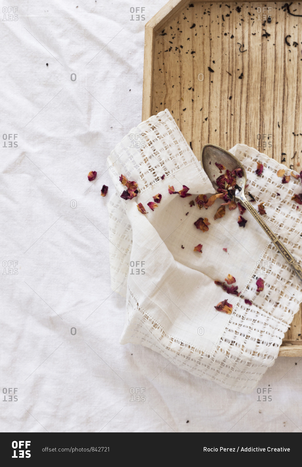 From above dried tea leaves and aromatic petals placed on napkin and tray over white fabric