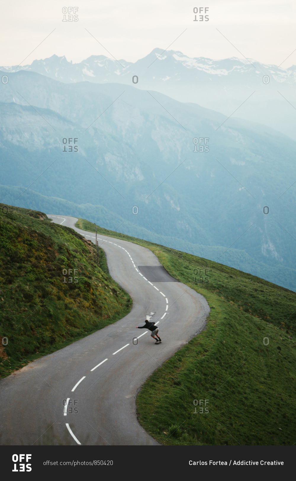 From above morning view of foggy Pyrenees mountains and male traveler skateboarding on serpentine