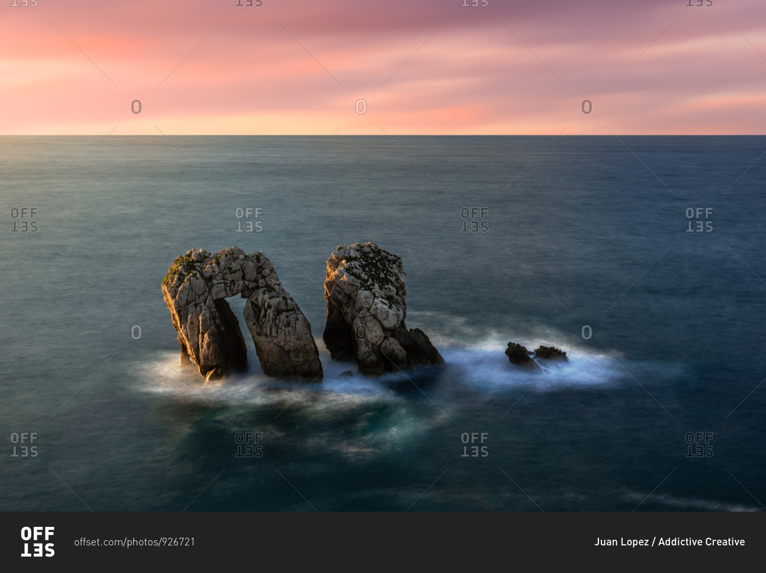 From above picturesque scenery of rough rocks among calm blue sea under colorful evening sky with sun beams breaking through clouds during twilight Costa Brava, Spain