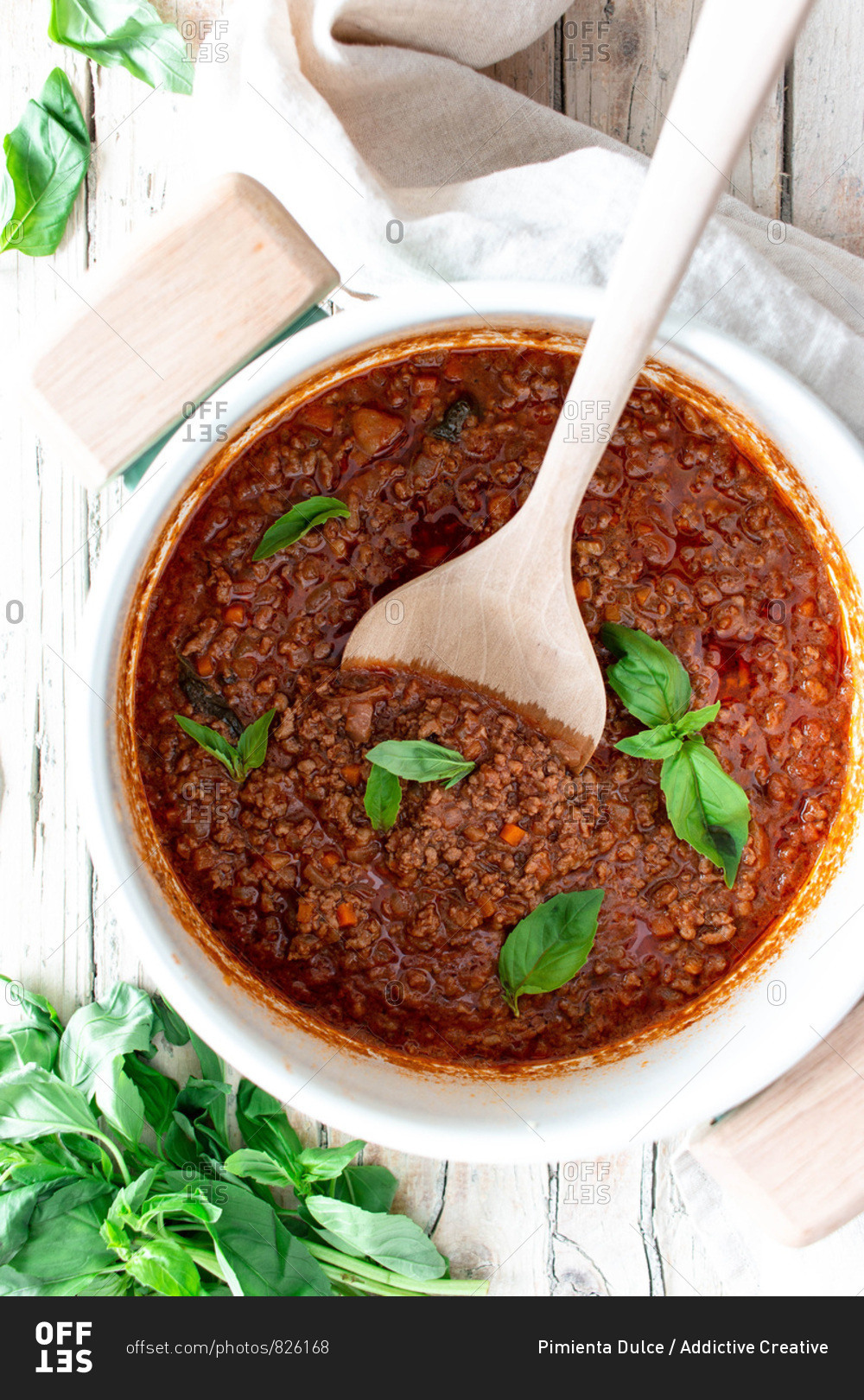 From above white ceramic pan with ragout Bolognese and spoon placed on wooden table with towel and basil