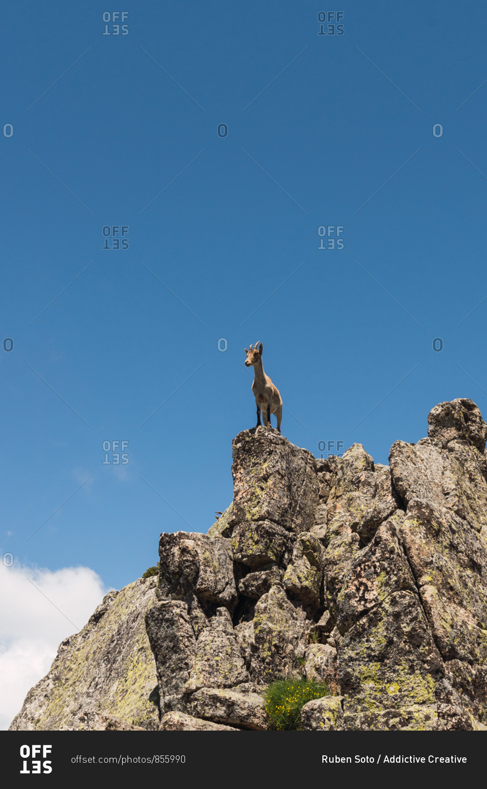 From below grey goats looking with curiosity standing on stony rocks on background of bright blue sky