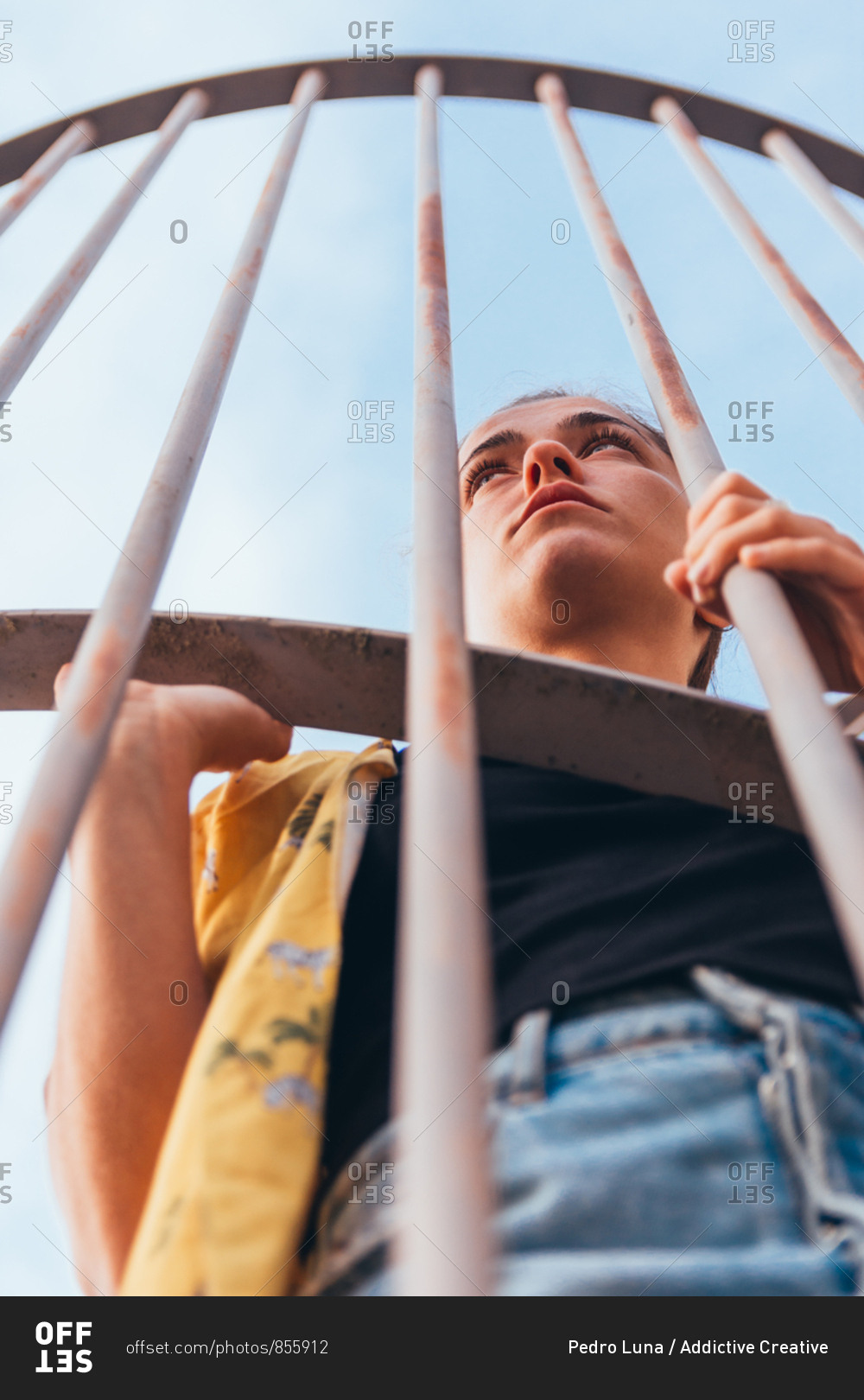 From below sensual casual woman standing in cage on clear sky in summer and looking away