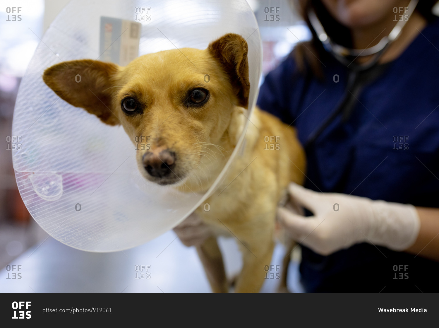 Front view close up of a female vet wearing blue scrubs and surgical gloves, examining a dog wearing a vet collar with a stethoscope at veterinary surgery.