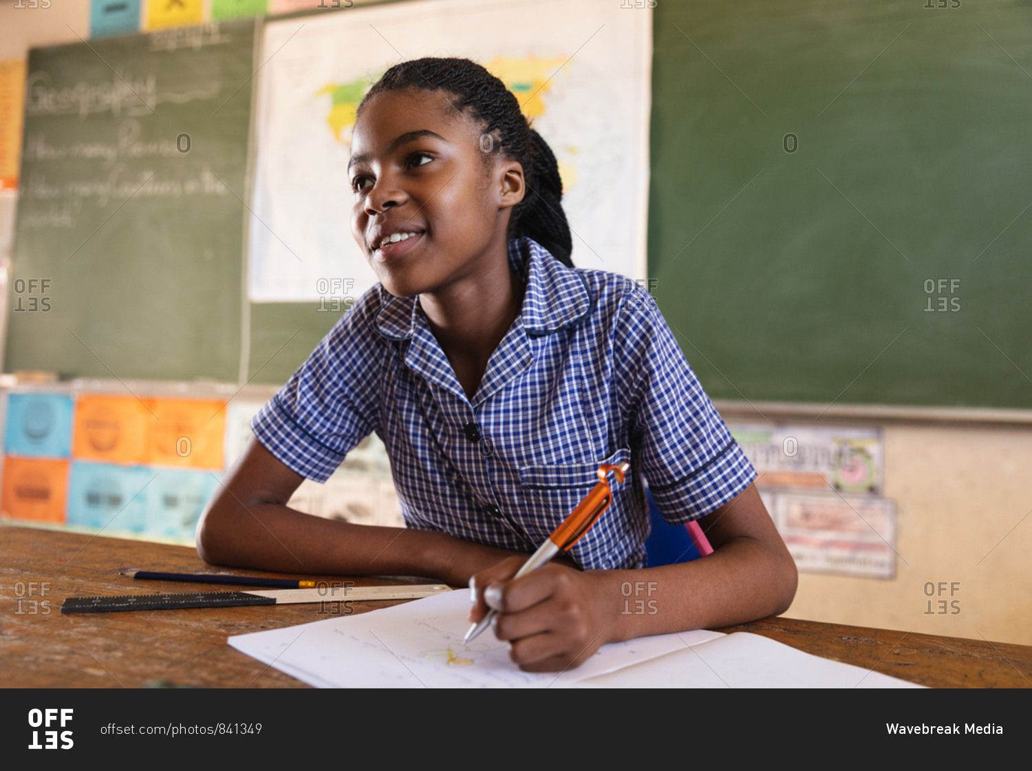 Front view close up of a young African schoolgirl sitting at a desk smiling, writing in her note book and listening attentively during a lesson in a township elementary school classroom