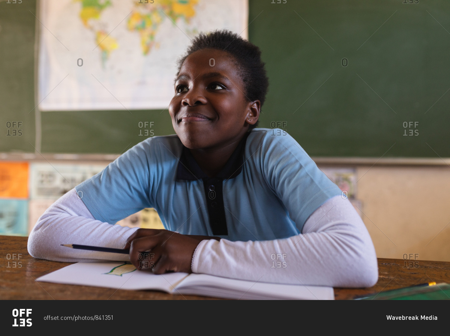 Front view close up of a young African schoolgirl sitting at a desk smiling and listening attentively during a lesson in a township elementary school classroom