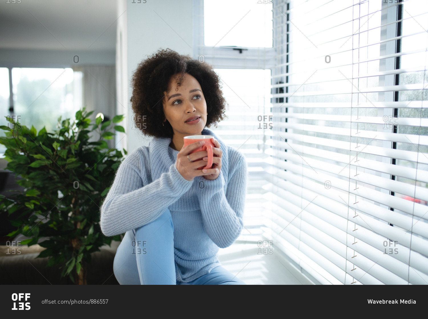 Front view of a mixed race woman relaxing at home, sitting on a window seat looking out of the window, holding a cup of coffee and smiling