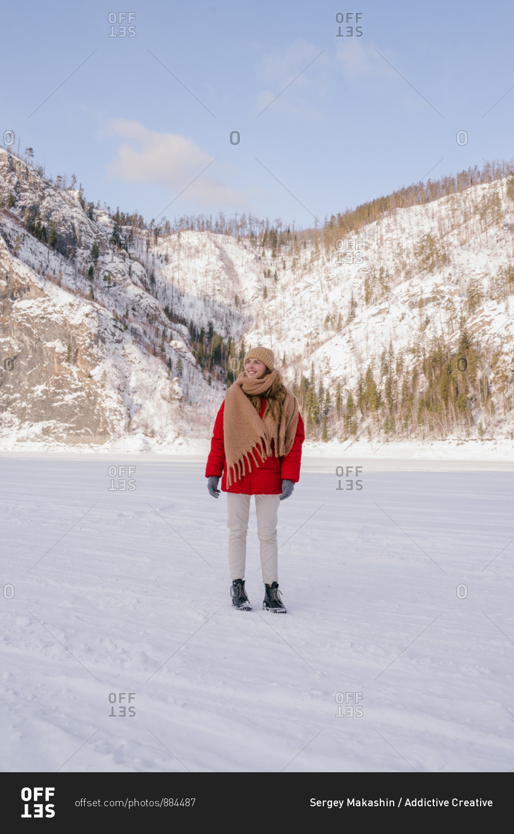 Frozen woman wrapped in scarf on winter day