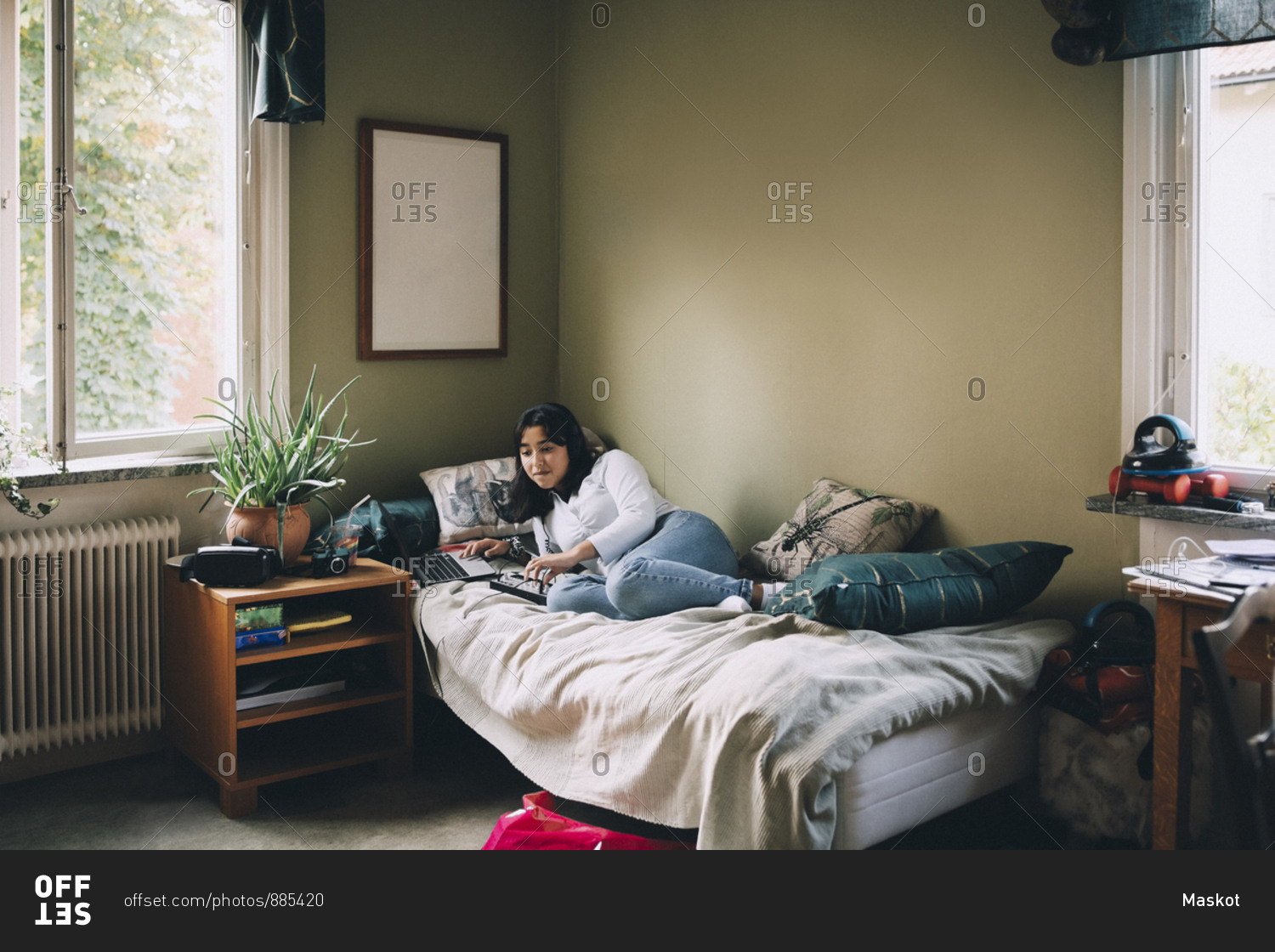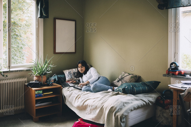 Full length of teenager using technology while lying on bed at home