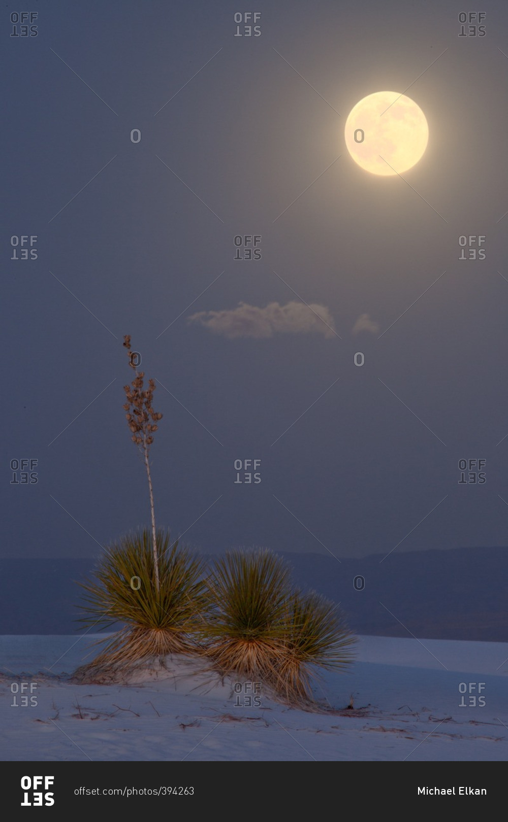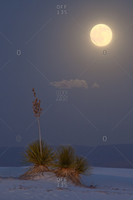 Full moon above Sacramento Mountains and two yucca plants in White Sands National Monument