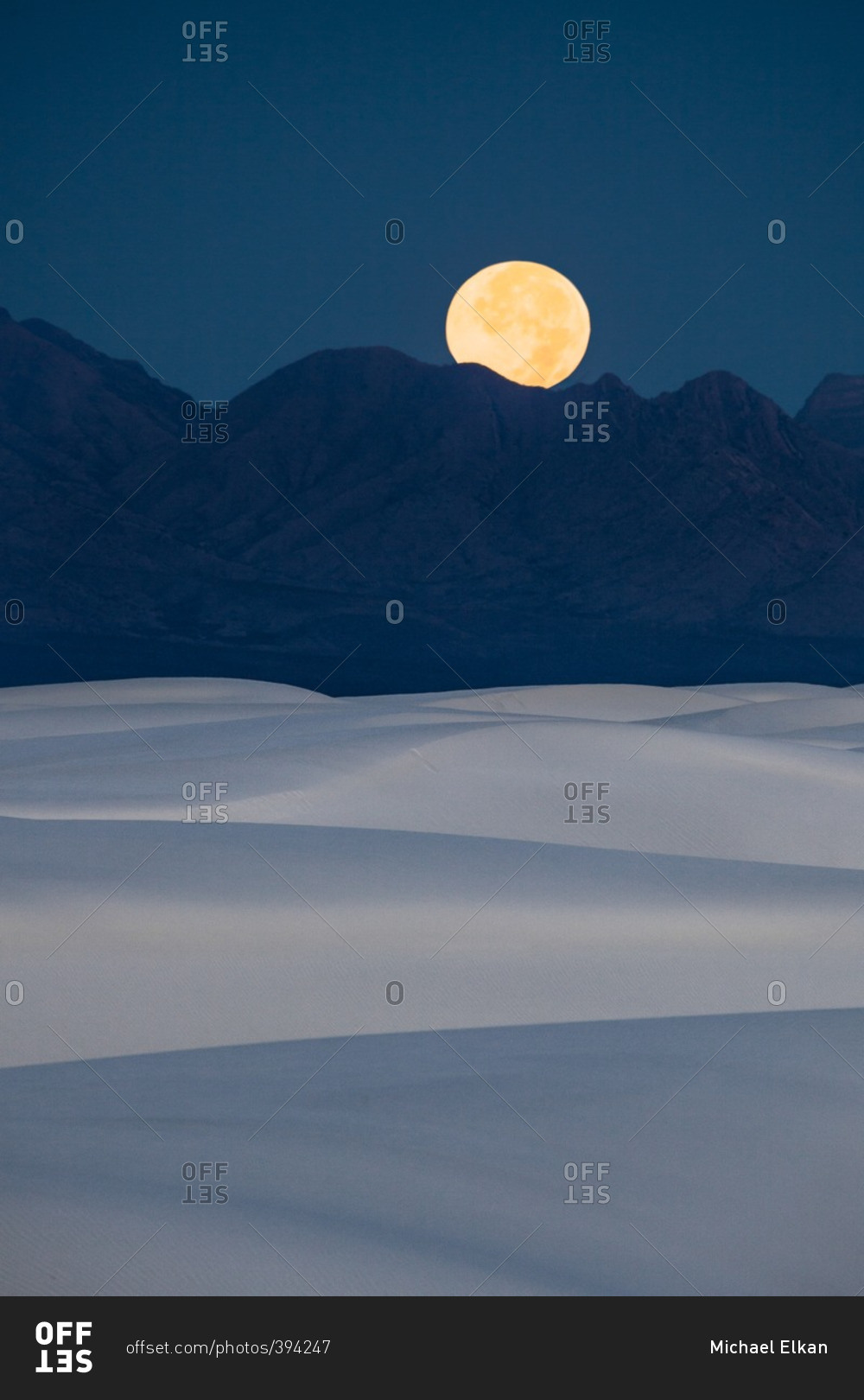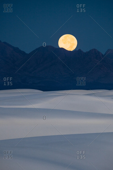 Full moon setting at dawn behind San Andres Mountains near White Sands National Monument, New Mexico