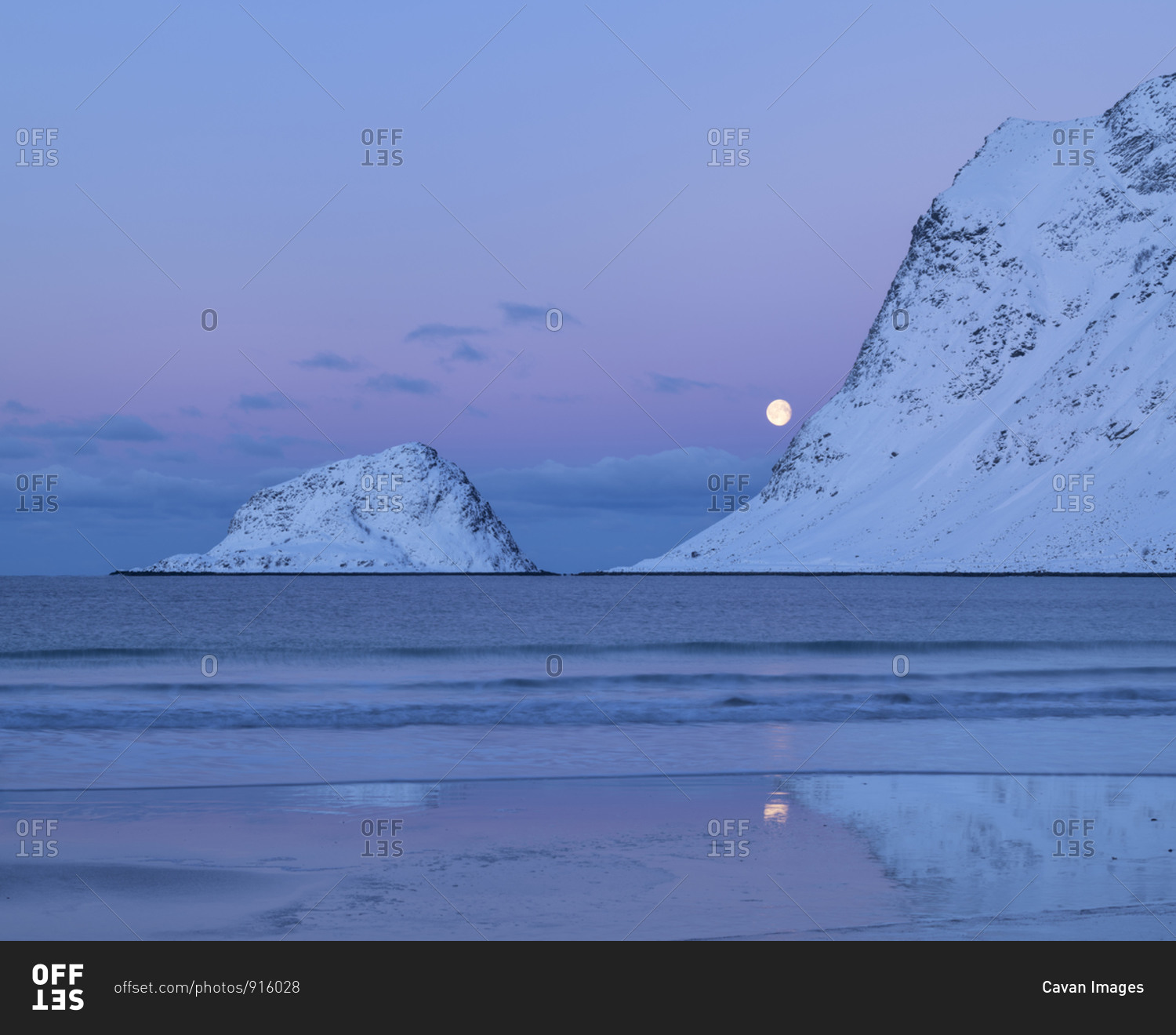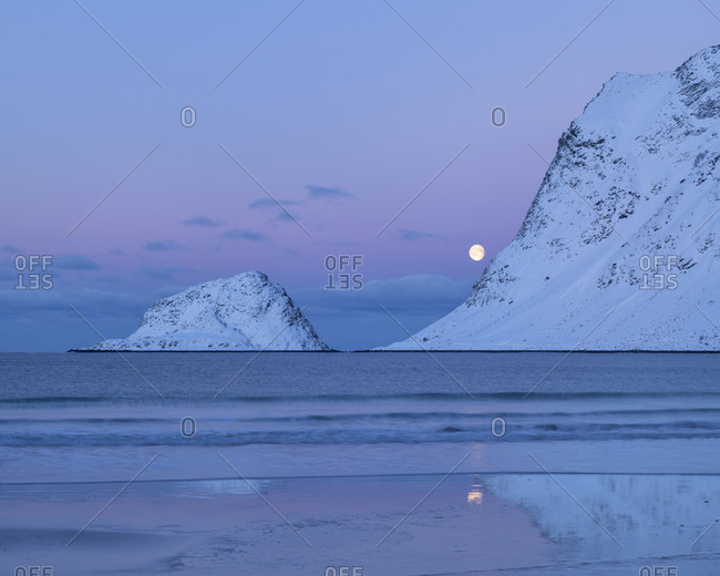 Full moon setting over Vik beach in winter twilight, Vestvågøy, Lofoten Islands, Norway
