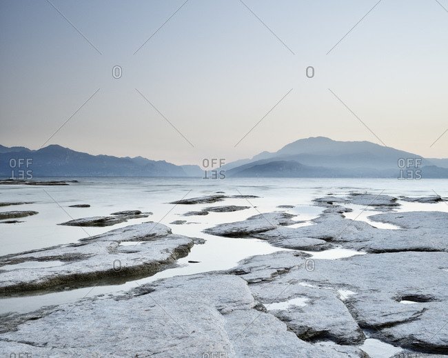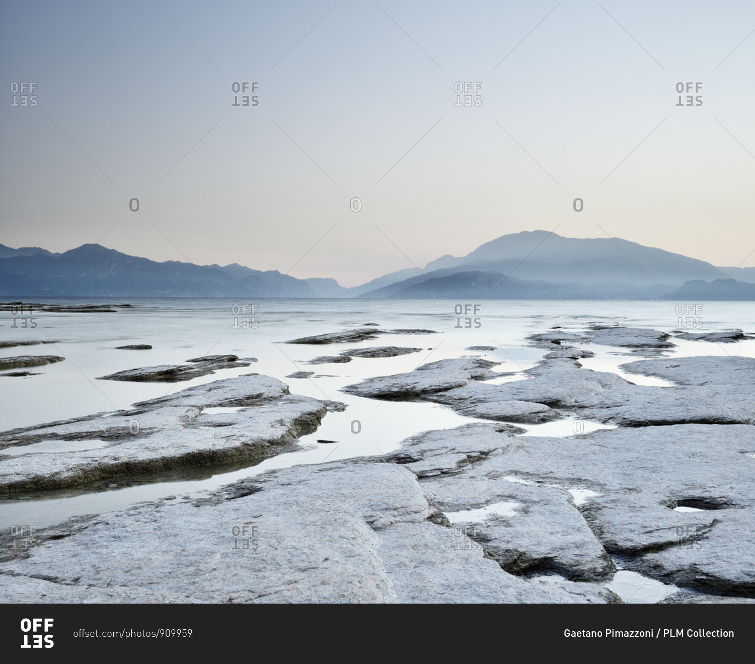 Garda lake at twilight from Sirmione, in the background the Monte Baldo mount, Brescia, Lombardy, Italy, Europe