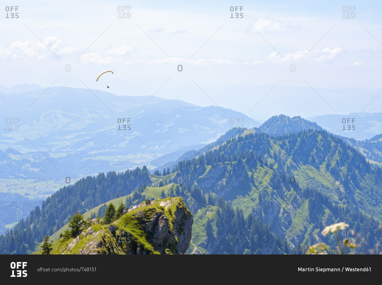Germany- Bavaria- Allgaeu- Oberallgaeu- Oberstaufen- Allgaeu Alps- View from Hochgrat- Nagelfluhkette- paraglider