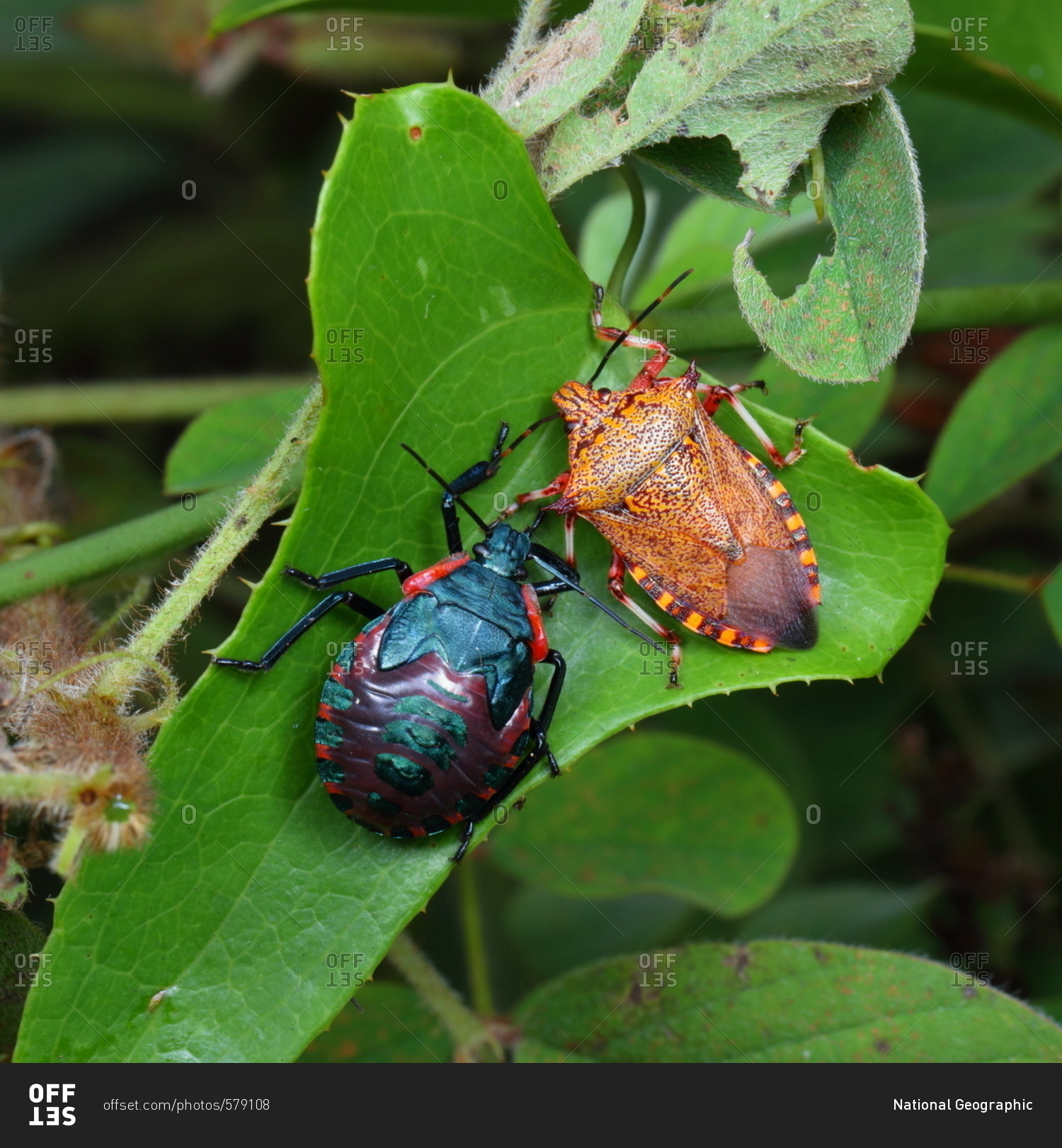 Giant strong nosed stink bugs, Alcaeorrhynchus grandis, adult and last instar nymph resting on a plant.
