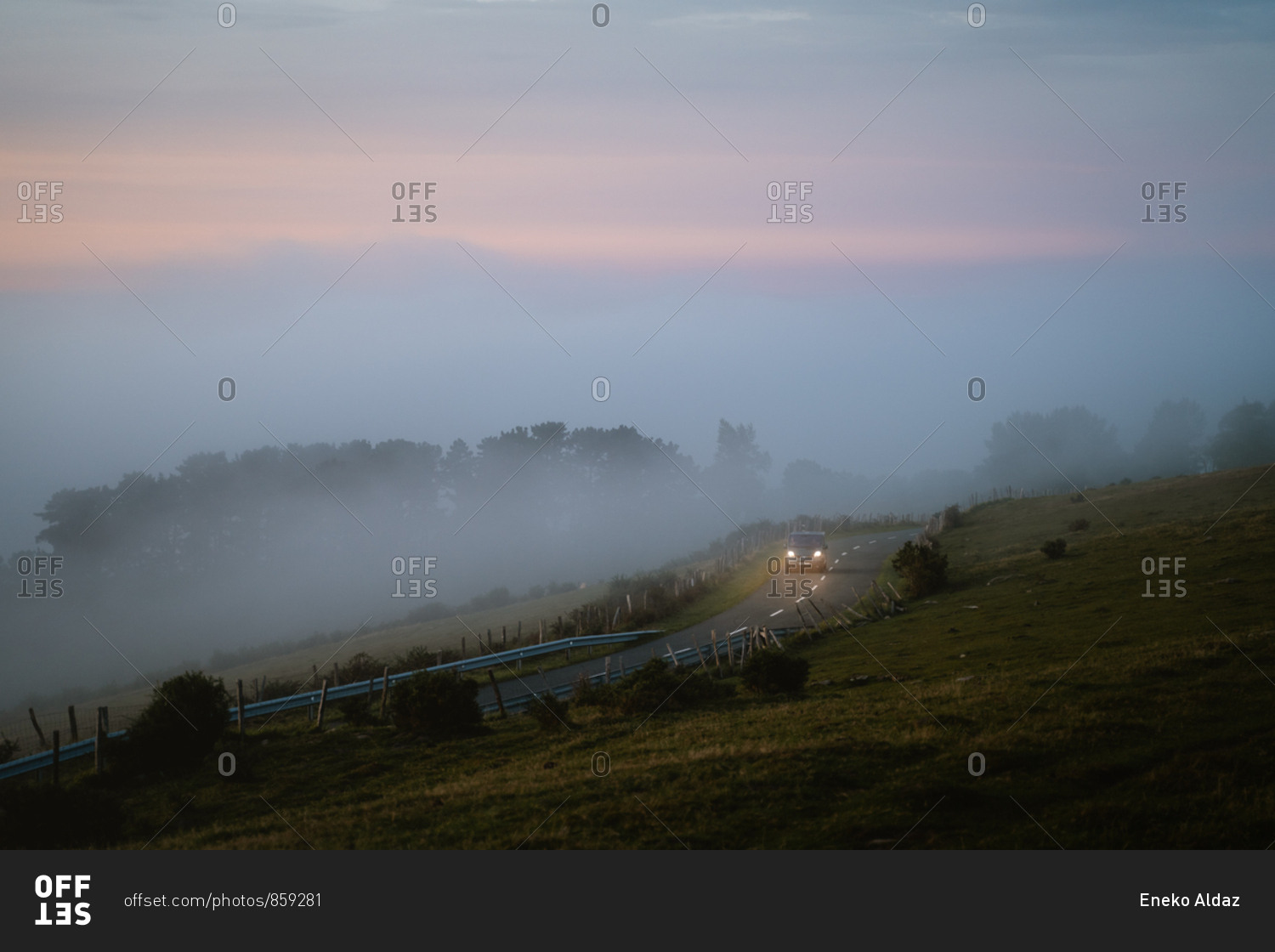 Gipuzkoa, Spain - September 13, 2019: Camper van driving through foggy road by the ocean during sunset