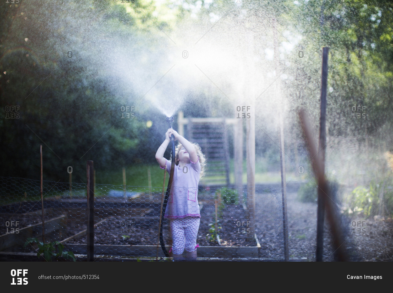 Girl playing with playing with garden hose