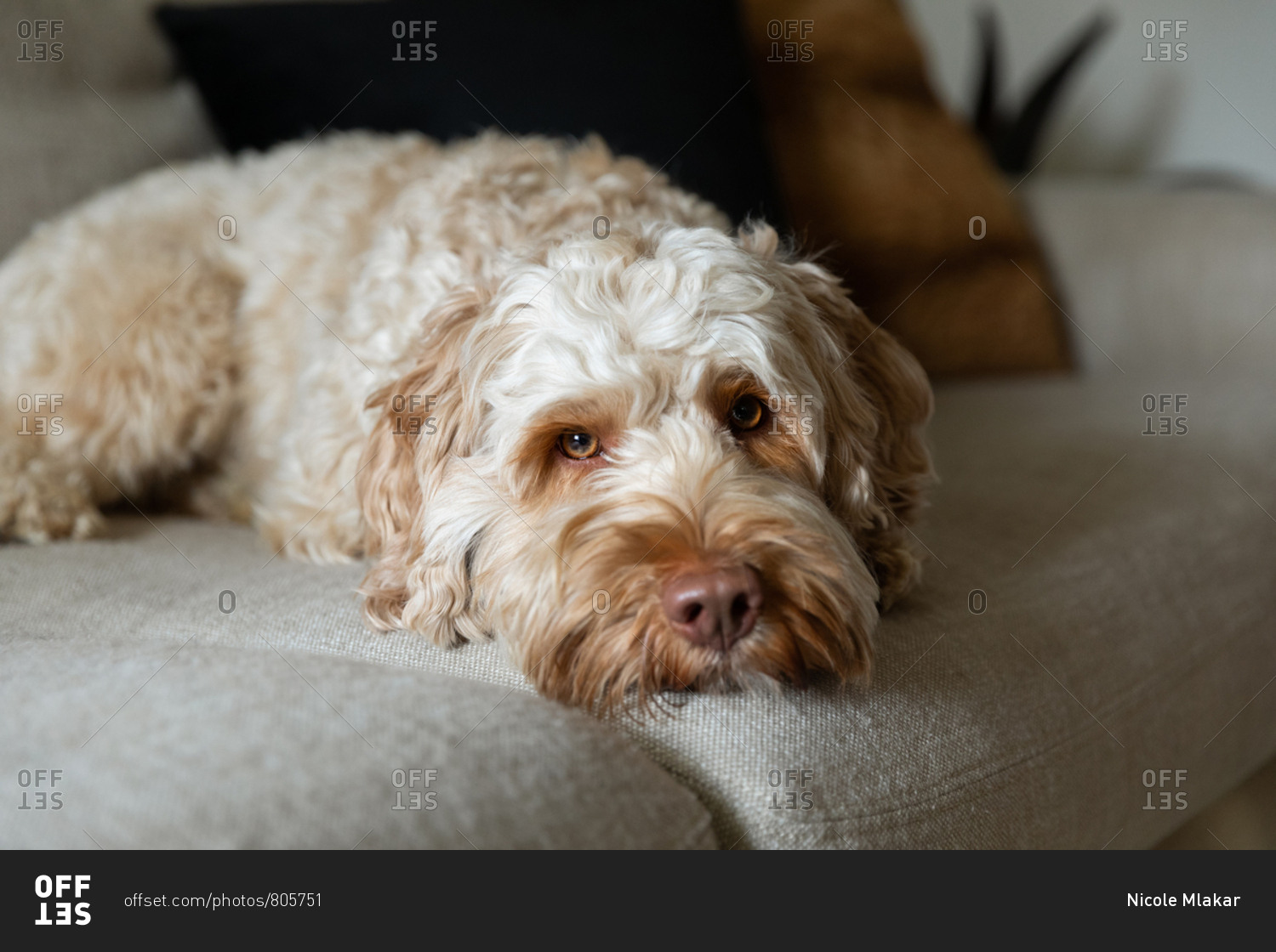 Goldendoodle laying on the couch and looking at the camera