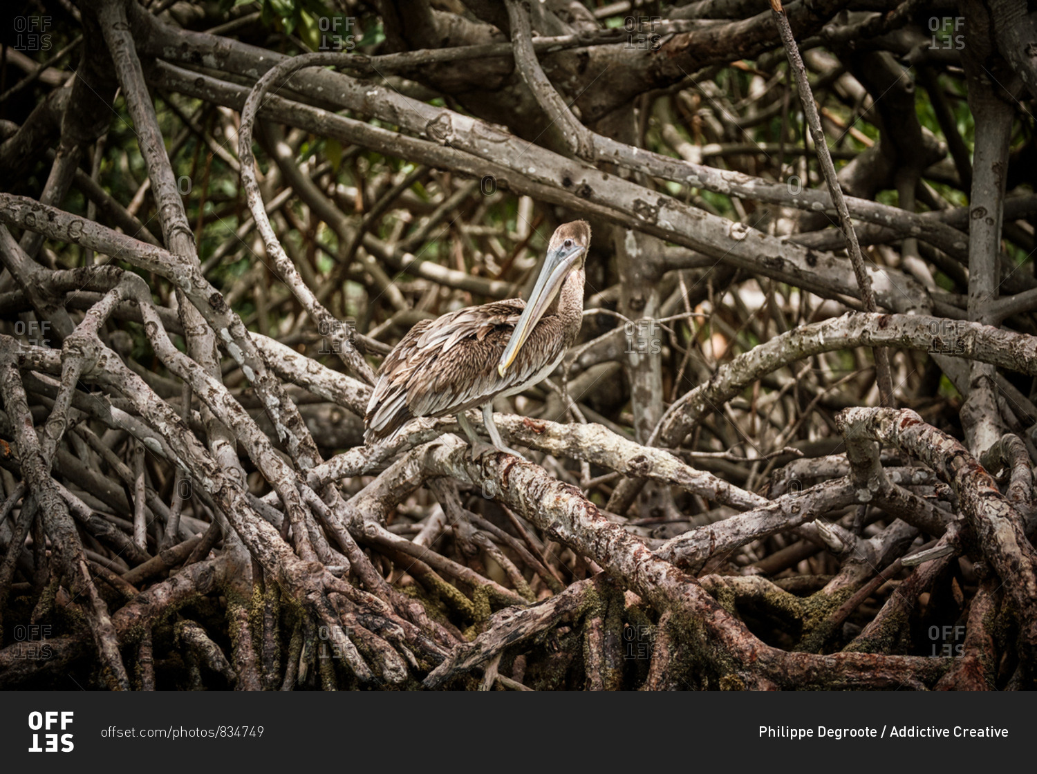 Gray pelican preening wing feathers while sitting on rough tree branches in nature