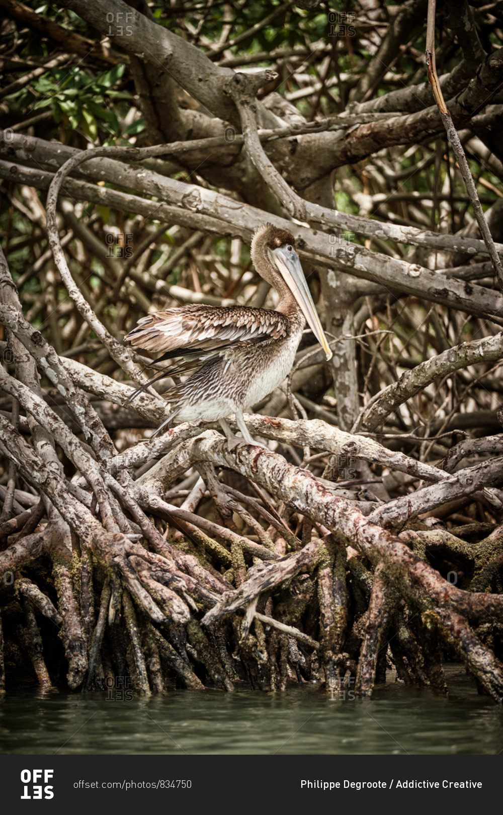 Gray pelican preening wing feathers while sitting on rough tree branches in nature