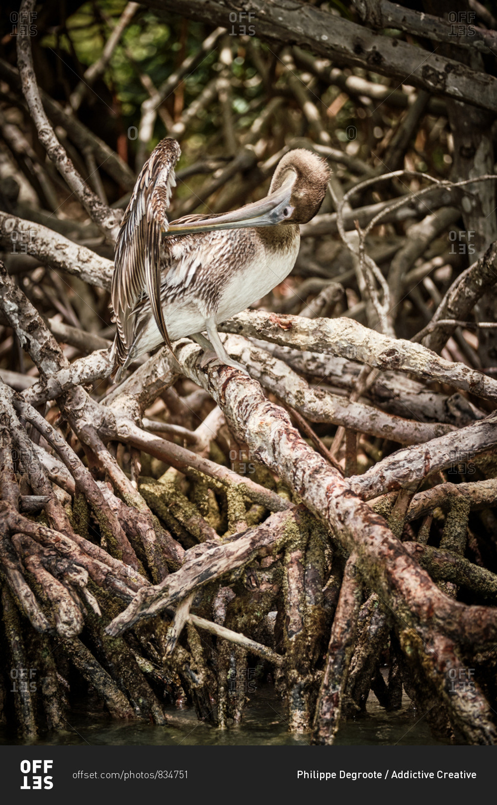 Gray pelican preening wing feathers while sitting on rough tree branches in nature
