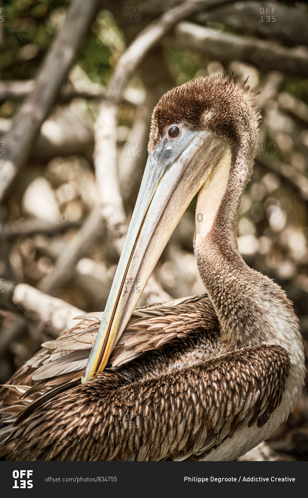 Gray pelican preening wing feathers while sitting on rough tree branches in nature
