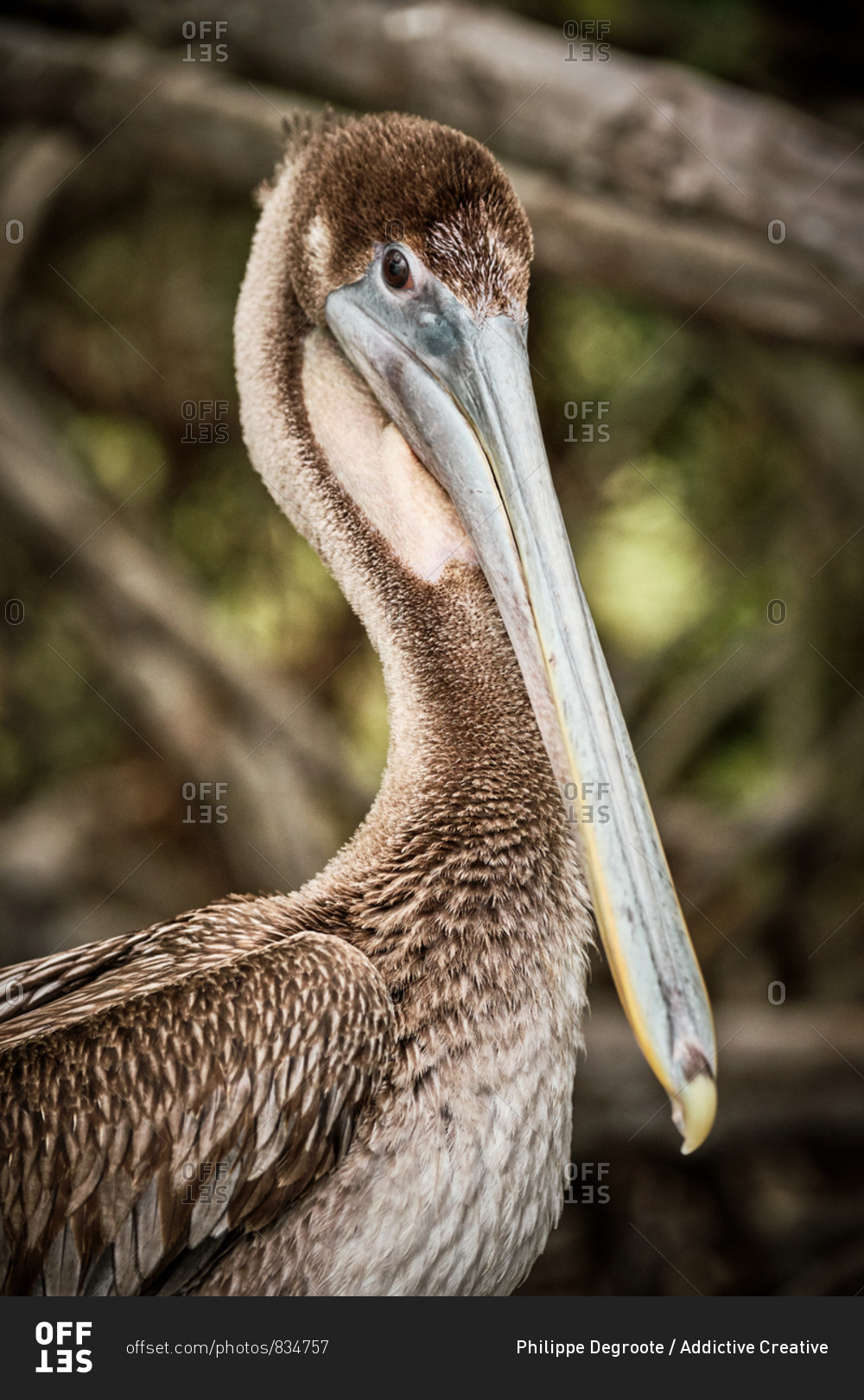 Gray pelican preening wing feathers while sitting on rough tree branches in nature