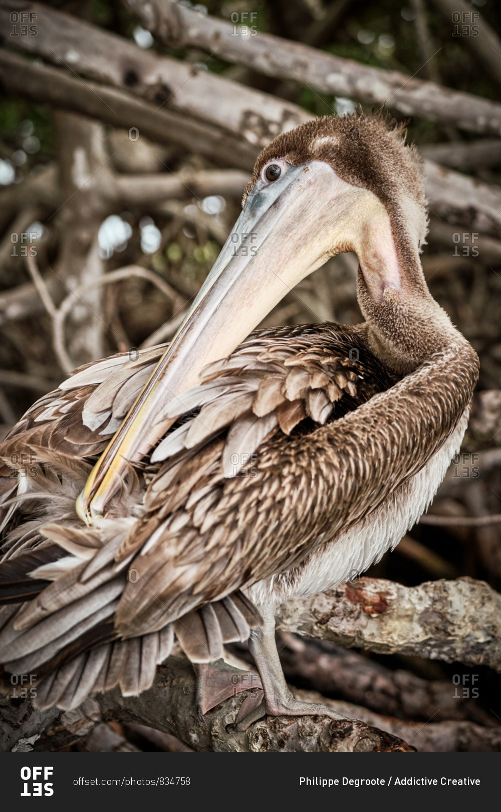 Gray pelican preening wing feathers while sitting on rough tree branches in nature