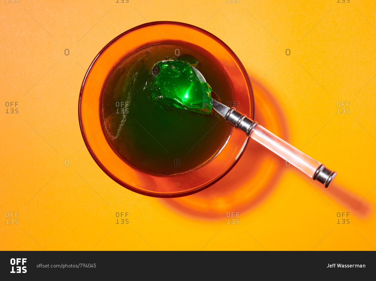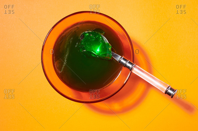 Green lime flavored gelatin dessert in orange serving glasses on orange background