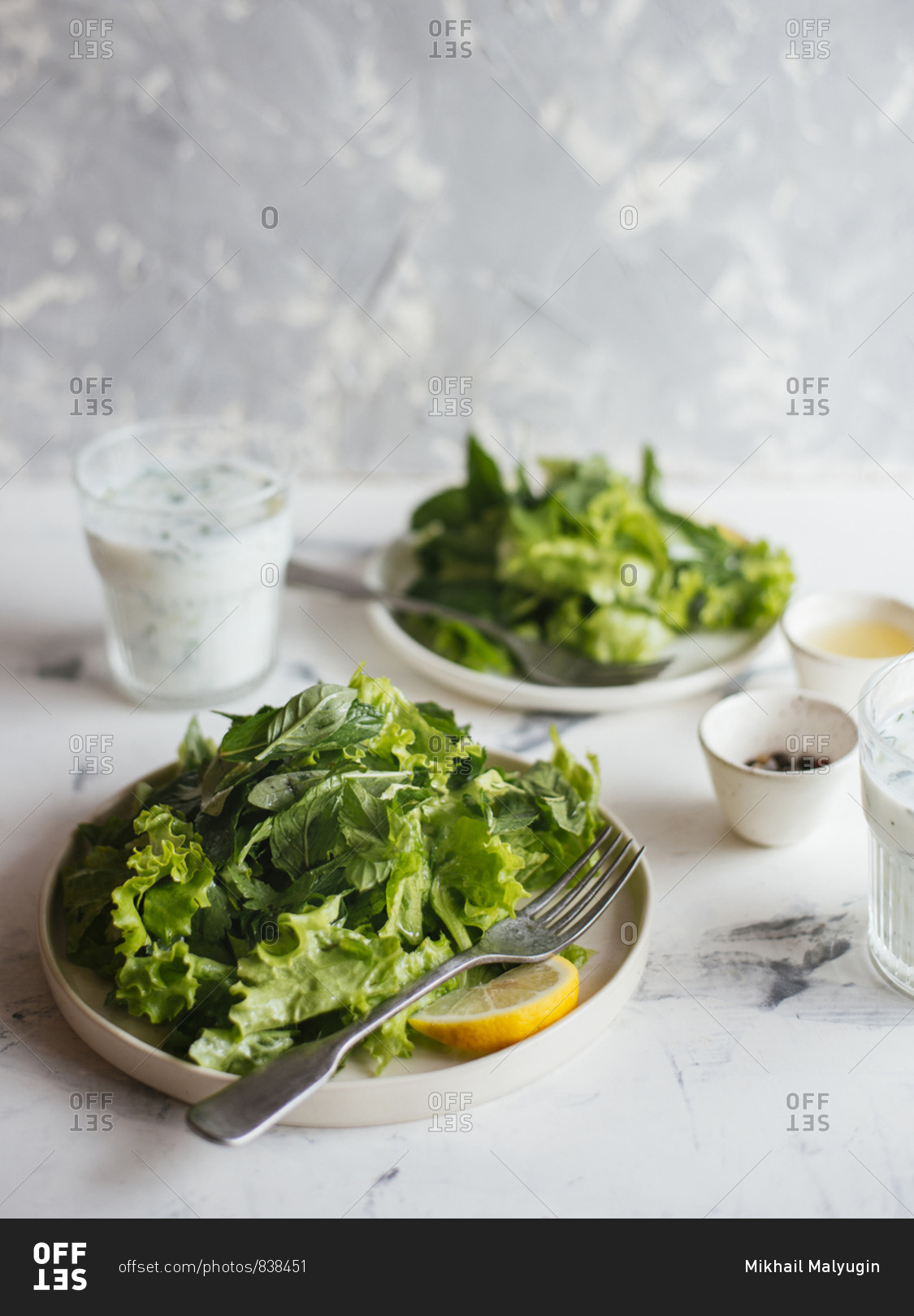 Green salad with herbs and lemon dressing served with sour yogurt dressing