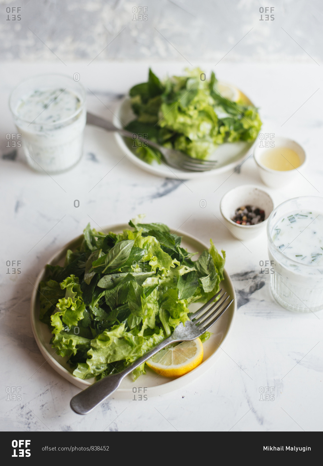 Green salad with herbs and lemon dressing served with sour yogurt dressing