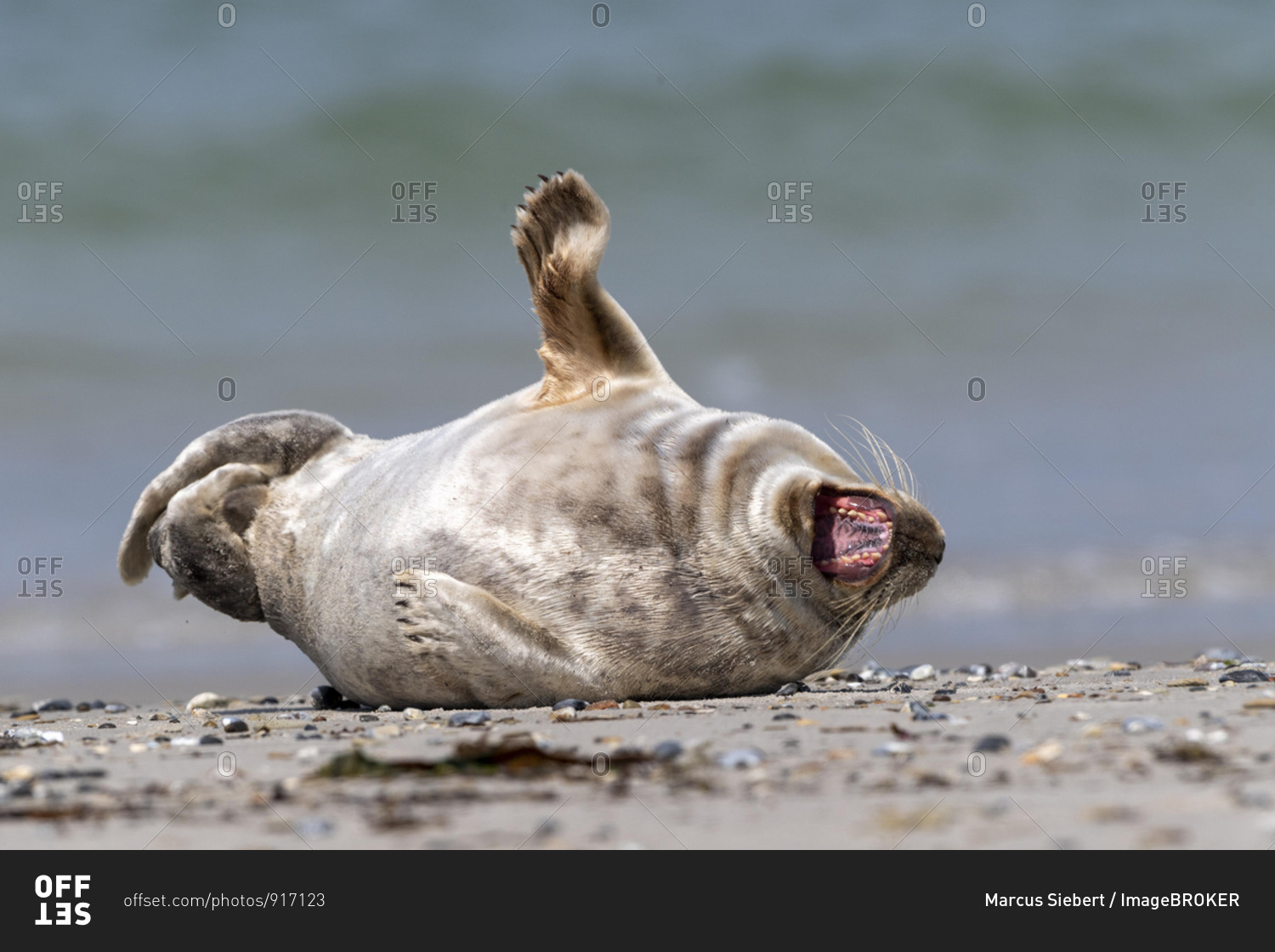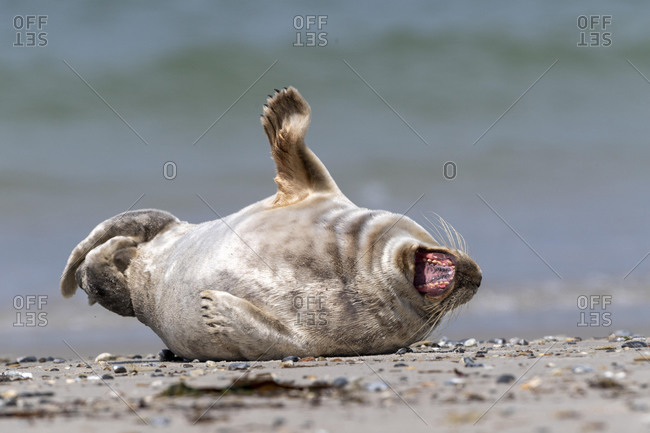 Grey seal (Halichoerus grypus) lies with open mouth on the beach, yawning, island D¸ne, Heligoland, Schleswig-Holstein, Germany, Europe