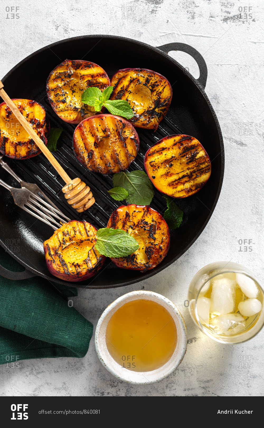 Grilled peach dessert on grill pan with cold tea and honey top view