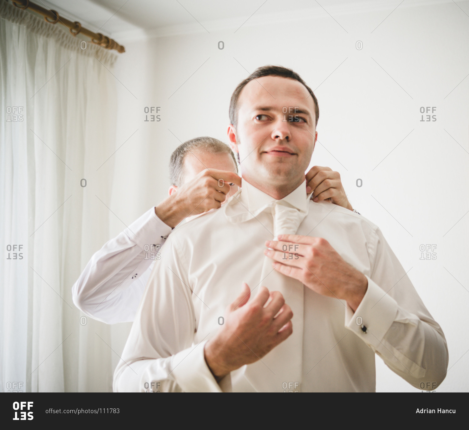 Groomsman fixing the groom's collar