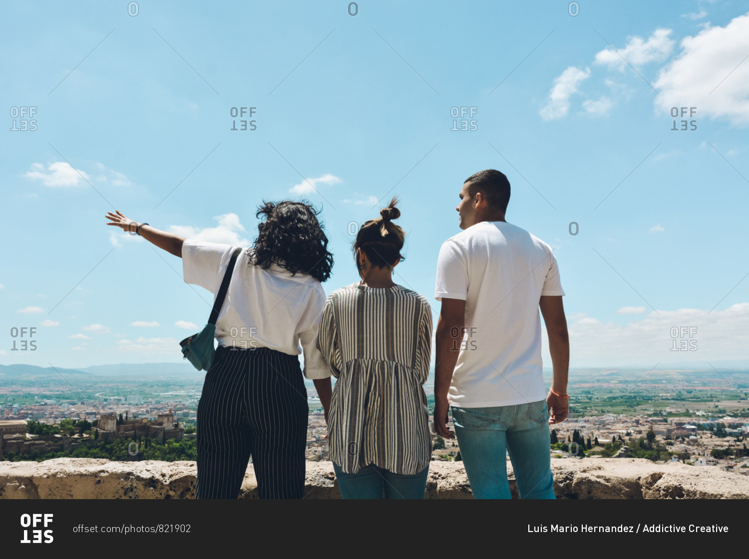 Group of friends doing tourism in Spain and contemplating the panoramic views of the Alhambra in Granada