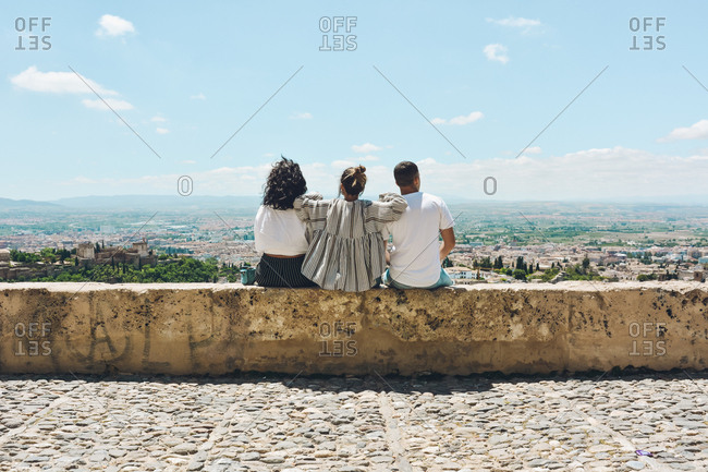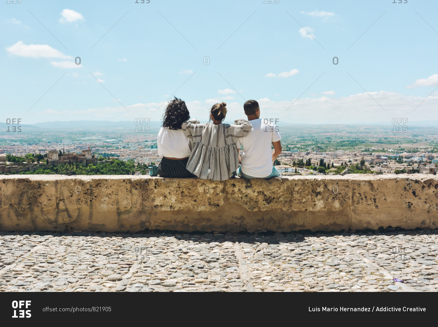 Group of friends doing tourism in Spain and contemplating the panoramic views of the Alhambra in Granada