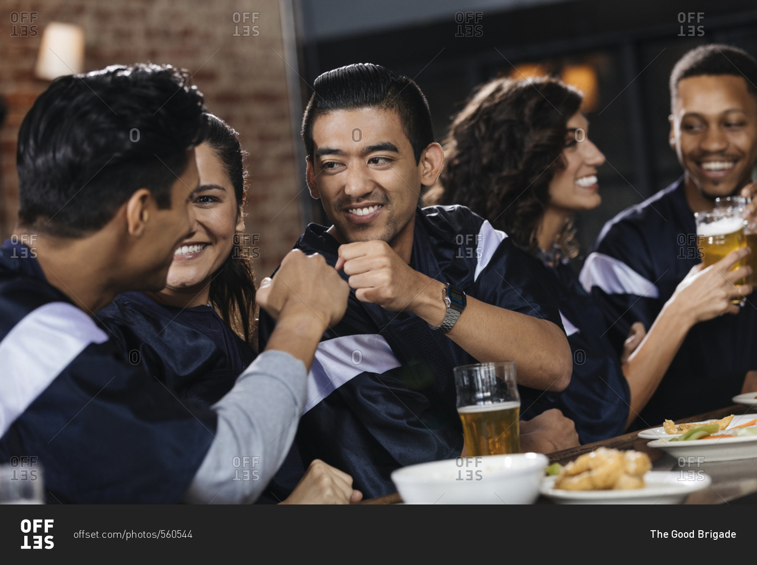 Group of friends giving fist bump while watching sports match with friends at counter in bar