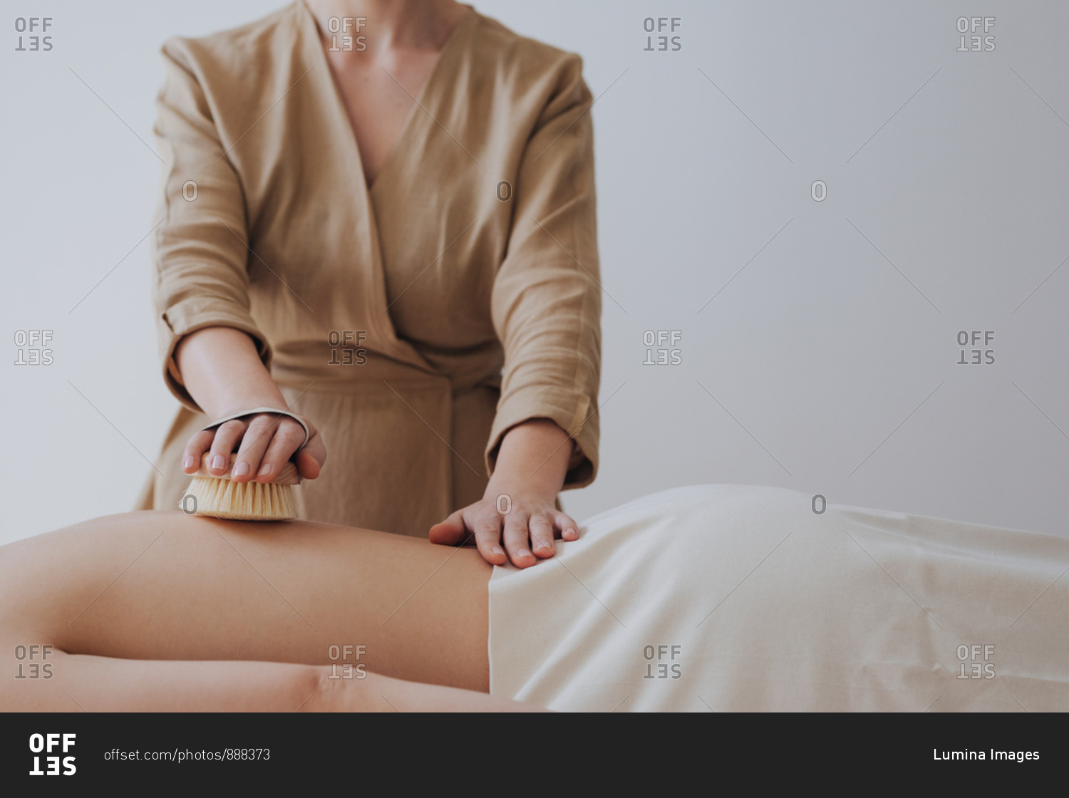 Hand of unrecognizable woman masseuse doing massage with brush on woman's back.