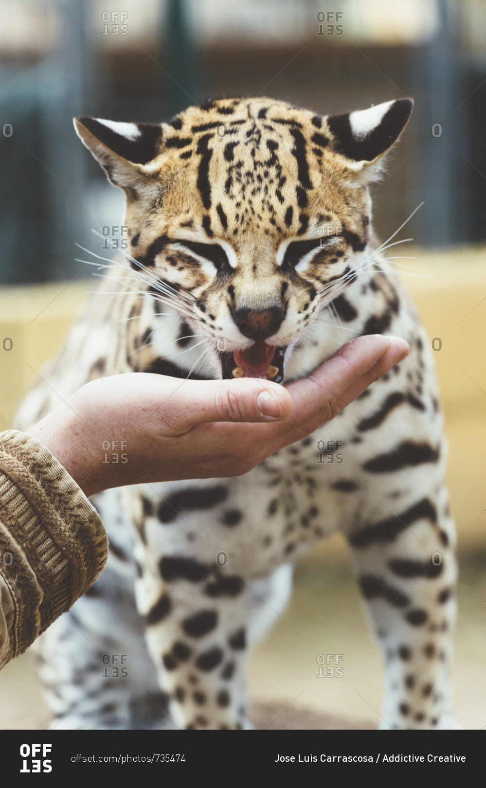 Hand stroking leopard in the zoo