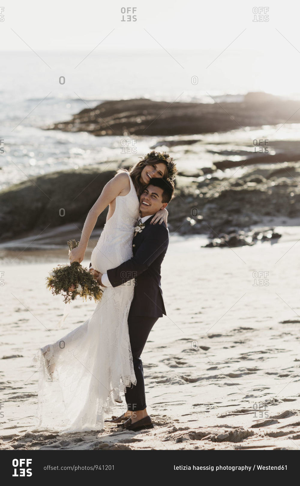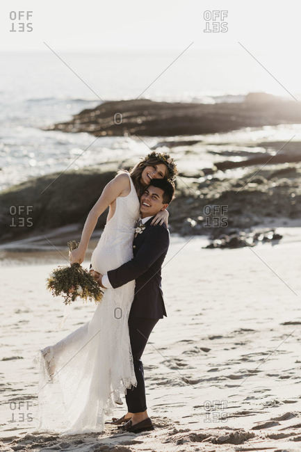 Happy bridal couple at the beach