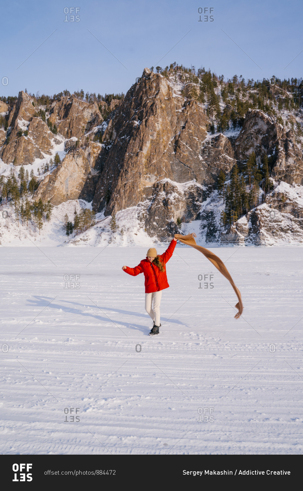 Happy female in red jacket running with scarf in raised hand on snowy valley with majestic rocks on background and enjoying sunny winter day in Siberia Russia