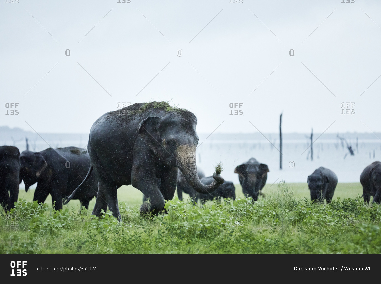 Herd Asian elephant grazing at Kaudulla National Park against clear sky