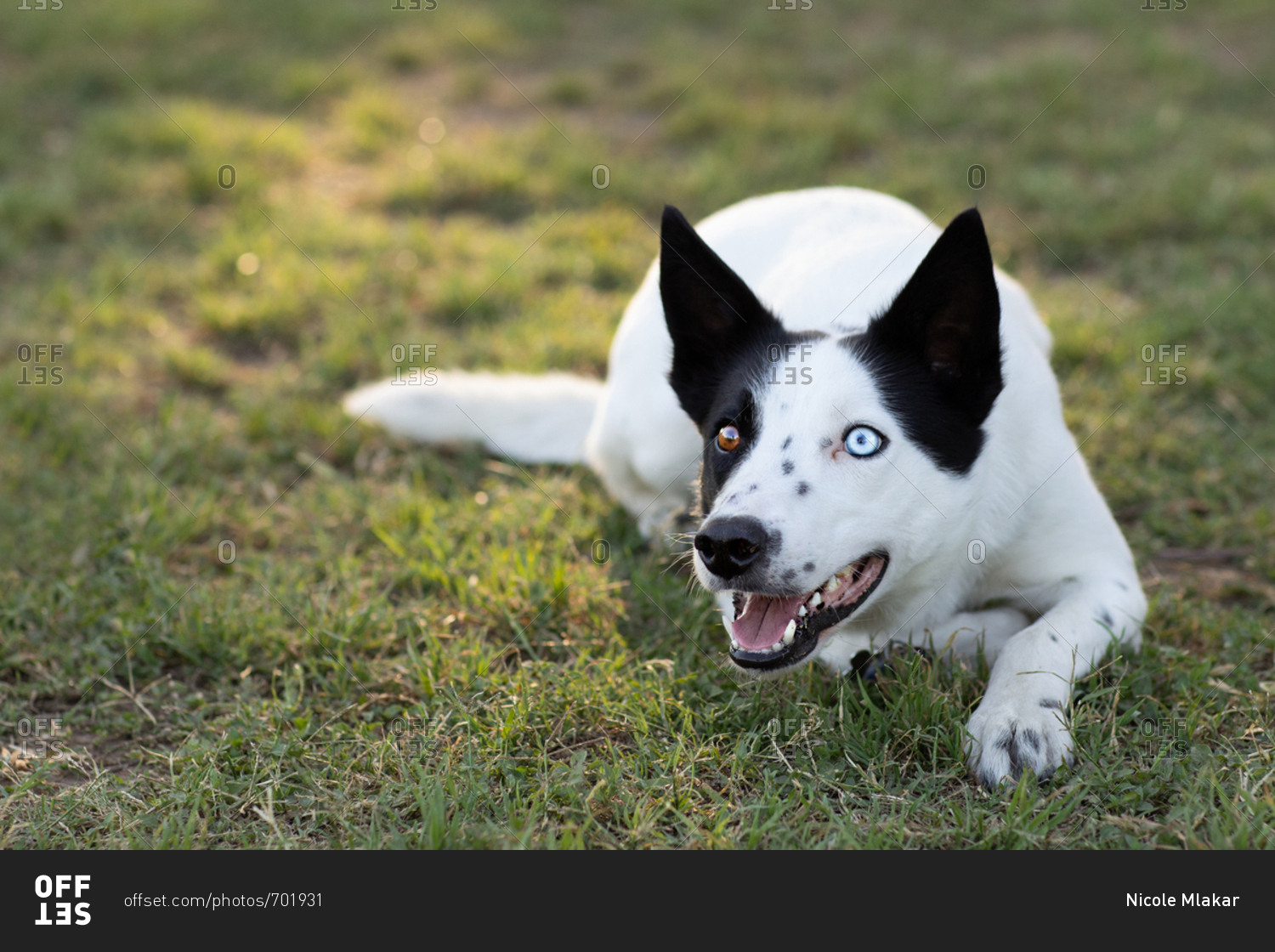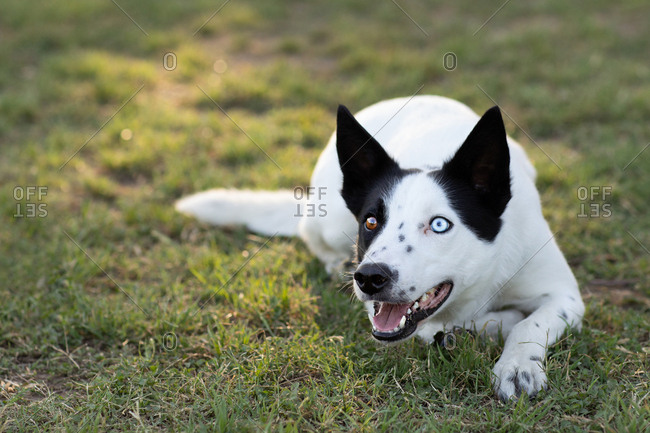 Heterochromatic dog lying on grass in semi-aggressive posture