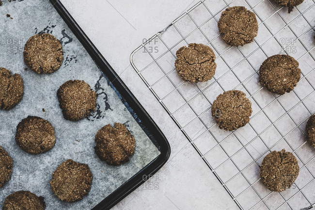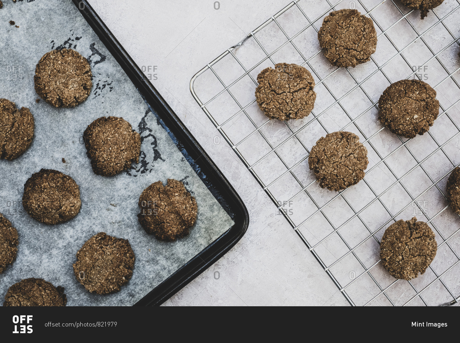 High angle close up of freshly baked chocolate cookies on a baking tray.
