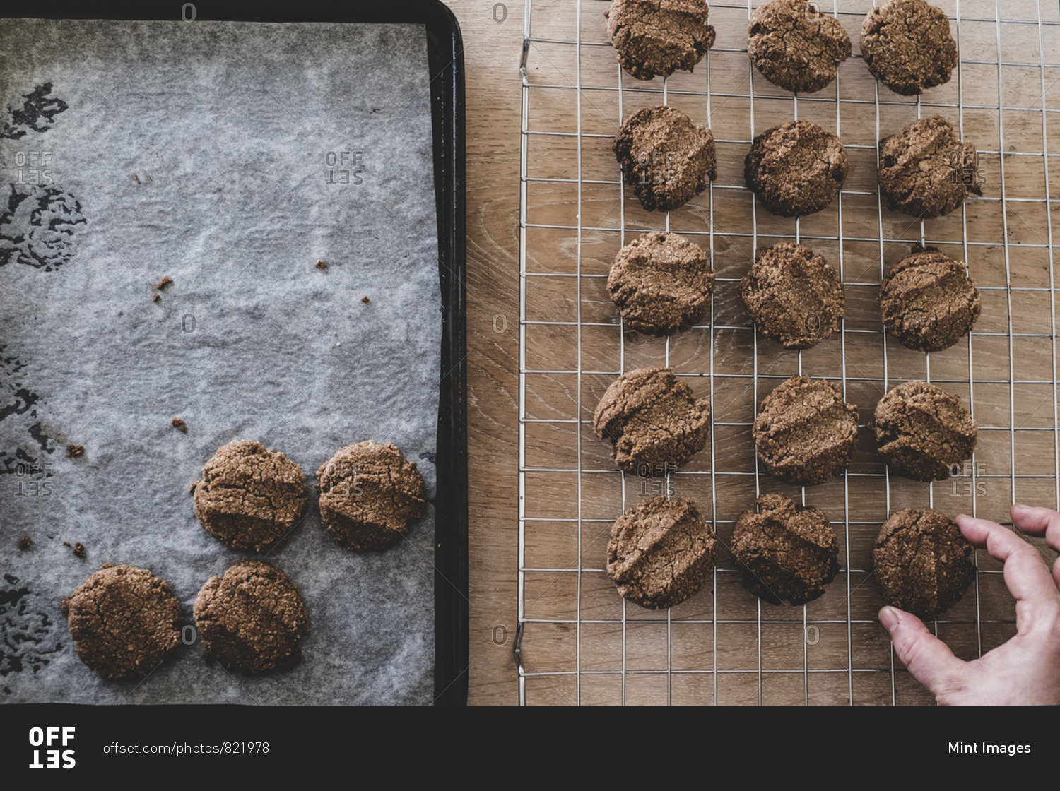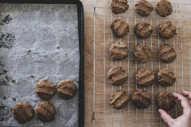 High angle close up of person removing freshly baked chocolate cookies from a baking tray.