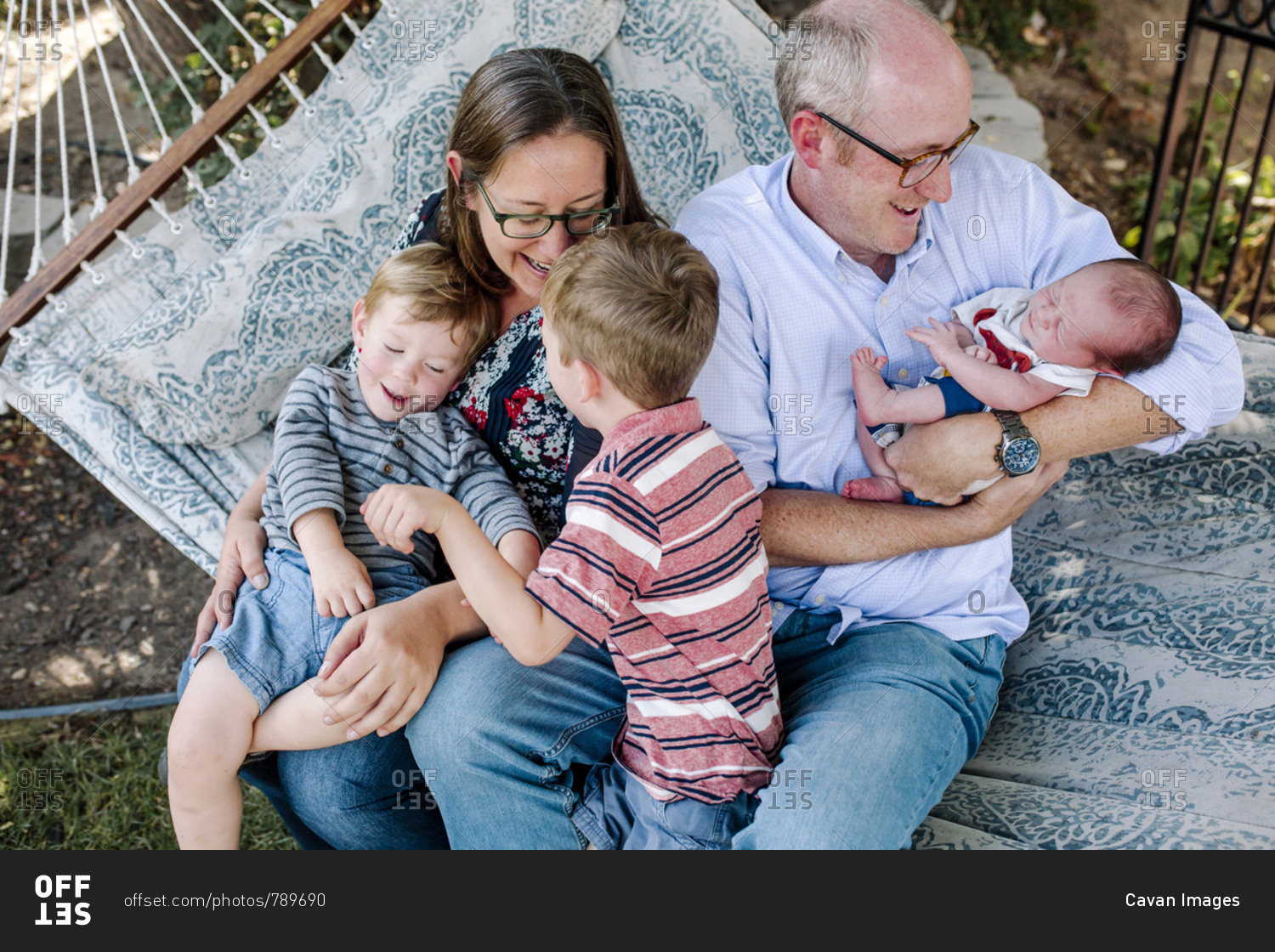 High angle view of happy playful family sitting on hammock at park