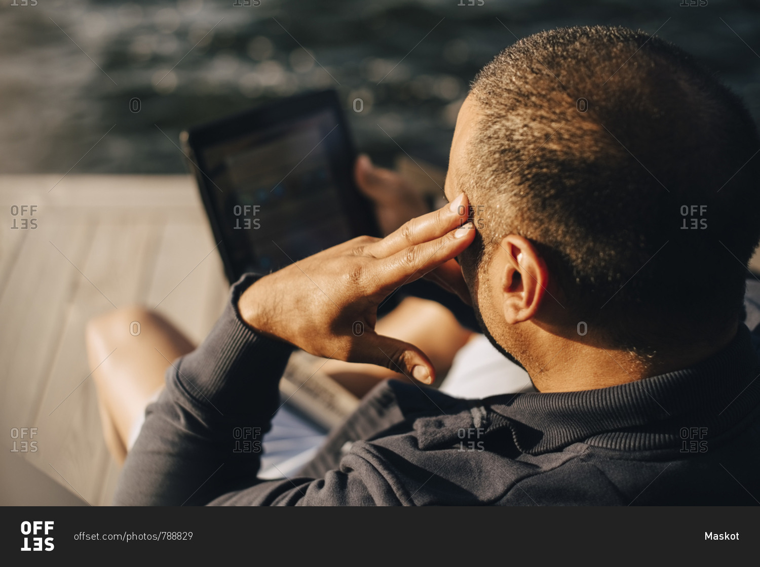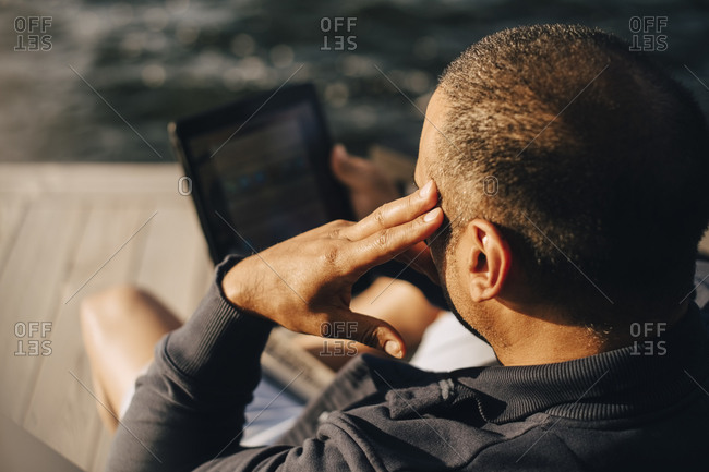 High angle view of man using digital tablet at patio