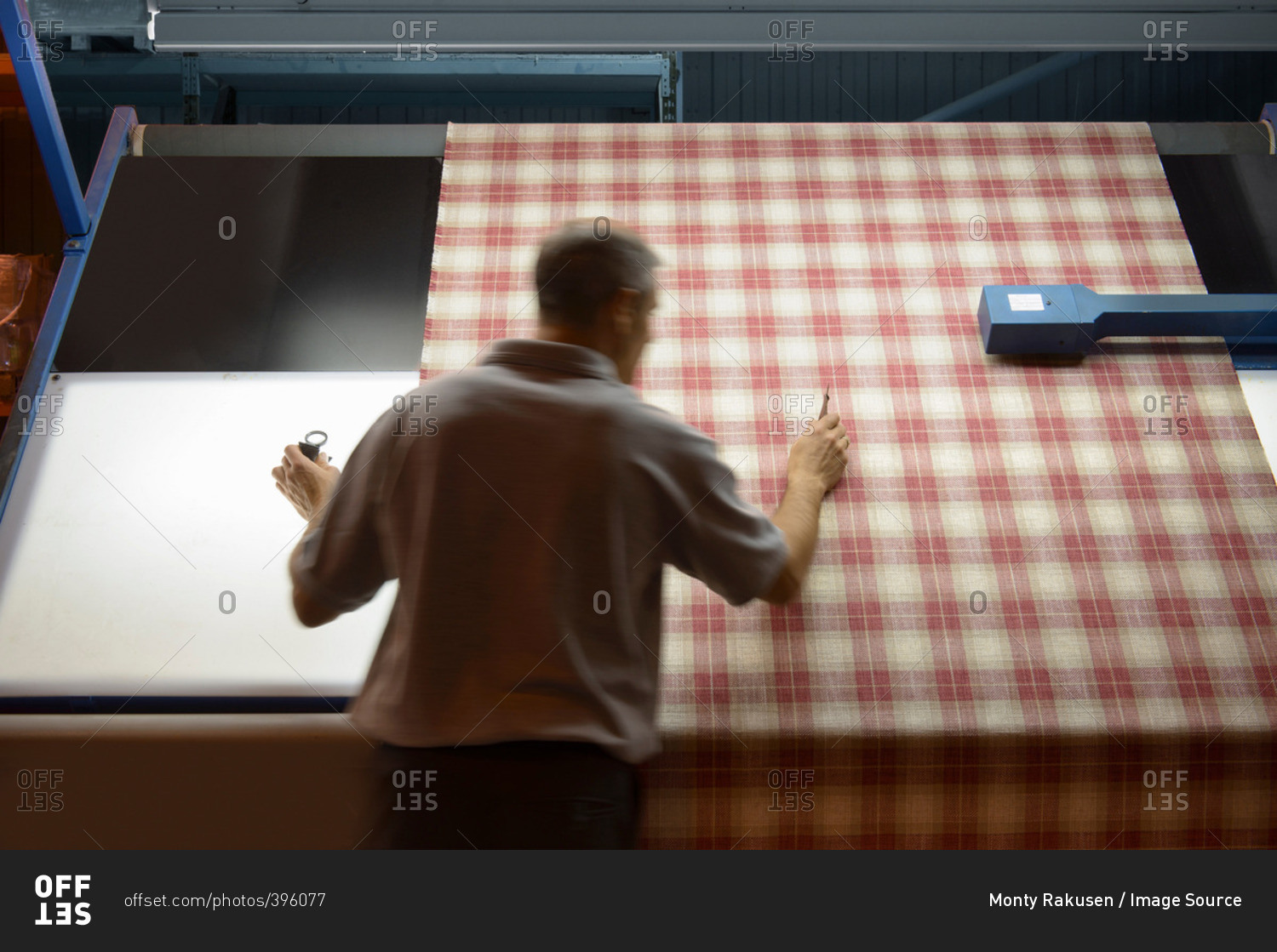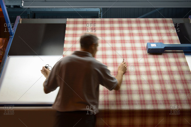 High angle view of textile worker inspecting checked woven thread in mill