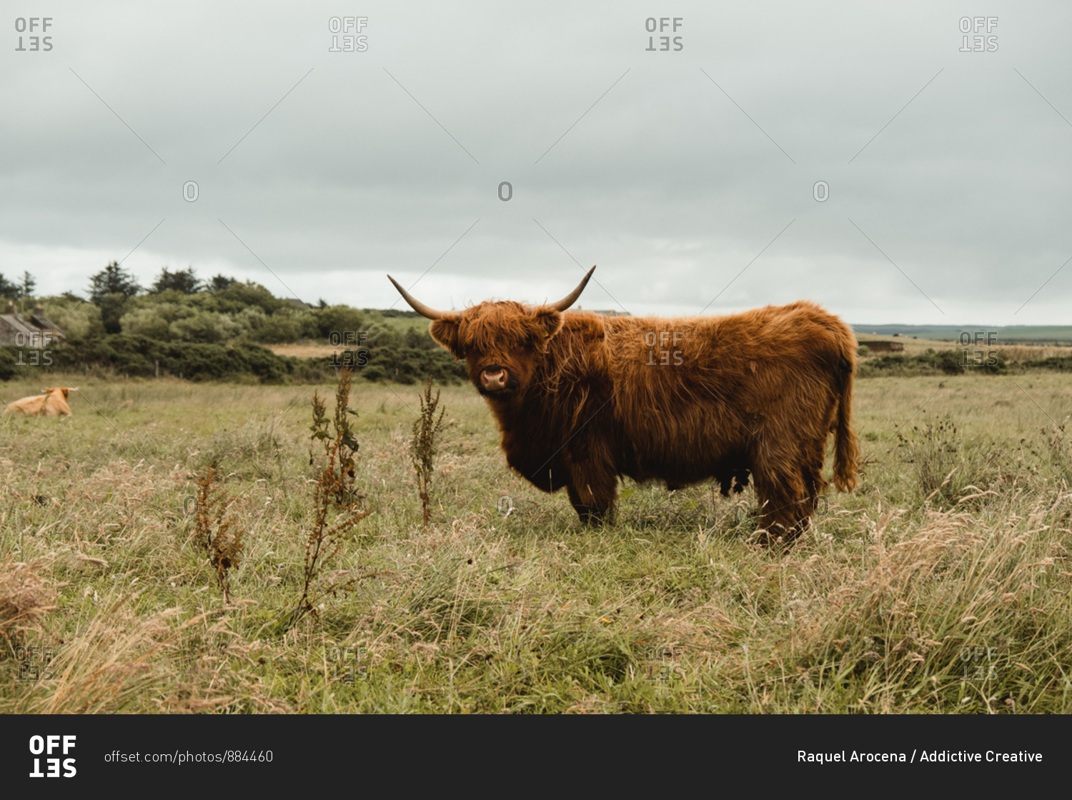 Highland cow grazing in green grassland at foot of mountain